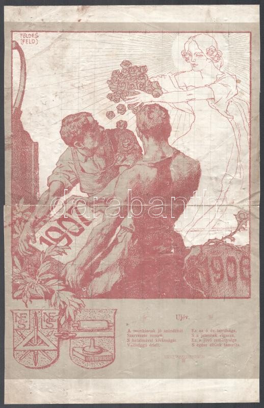 Földes (Feld) Imre (1881-1948): Újév 1907. Nyomat, papír, viseltes áll... https://www.darabanth.com/hu/424-Gyorsarveres/424.0/Mutargy-papirregiseg-egyeb/Nyomtatvanyok~2000002/Foldes-Feld-Imre-1881-1948-Ujev-1907-Nyomat-papir-viseltes-allapotban-kisebb-szakadas~II2696200