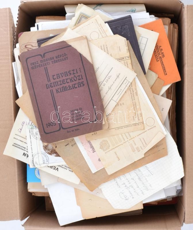 Leírás: Nagy doboznyi vegyes papírrégiség: nyomtatványok, sok reklám, okmányok, stb, érdekes különlenyomatok, érdemes átnézni