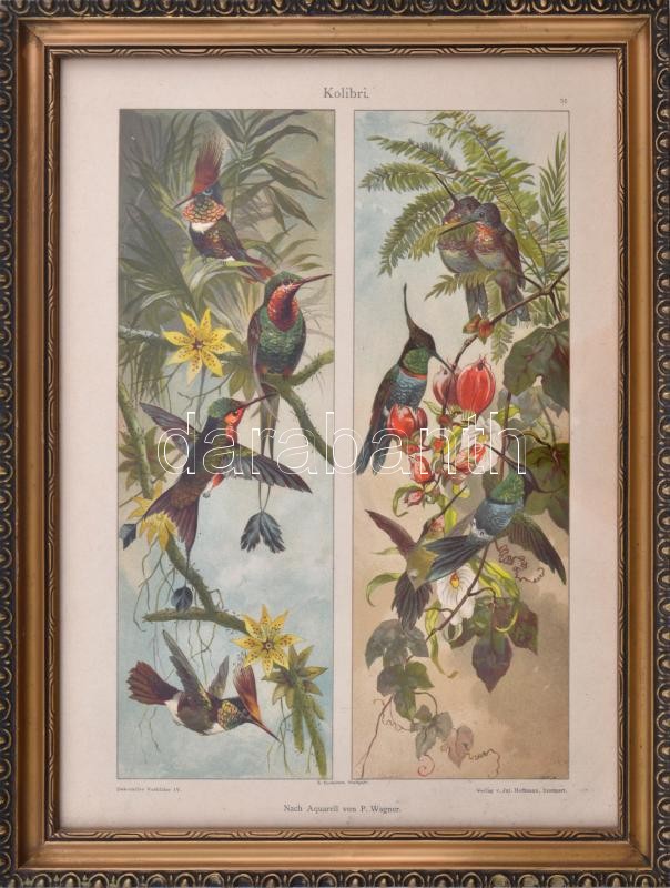 Leírás: cca 1895 Kolibri, a Dekorative Vorbilder sorozatból, P. Wagner munkája, nyomat, papír. 34x25 cm, üvegezett fakeretben