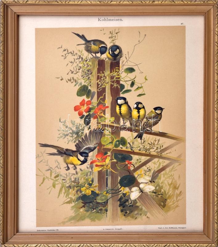 Leírás: cca 1900 Cinkék (Kohlmeise), a Dekorative Vorbilder sorozatból, nyomat, papír. 32x24 cm, üvegezett fakeretben,