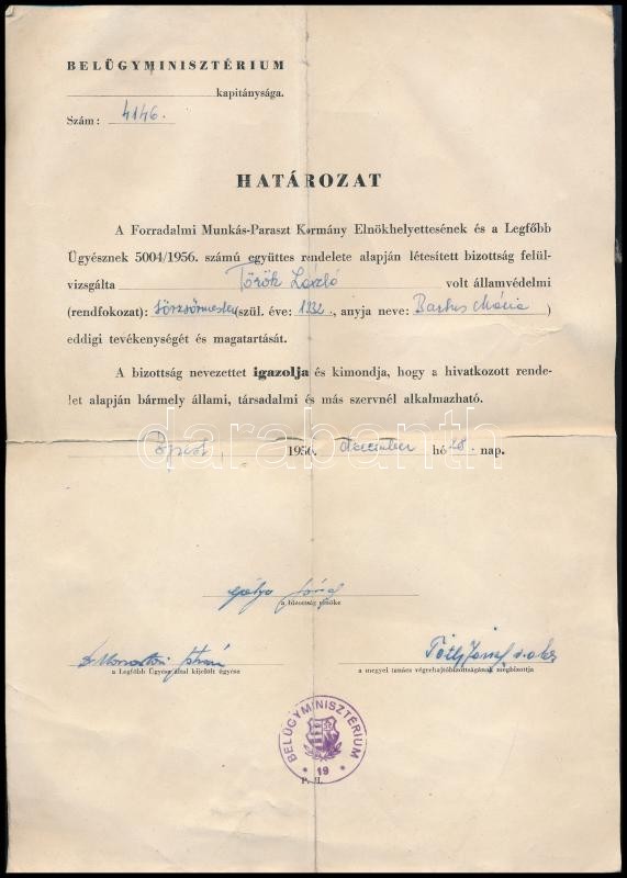 Leírás: 1956 Volt Ávós tiszt igazoló bizonyítványa