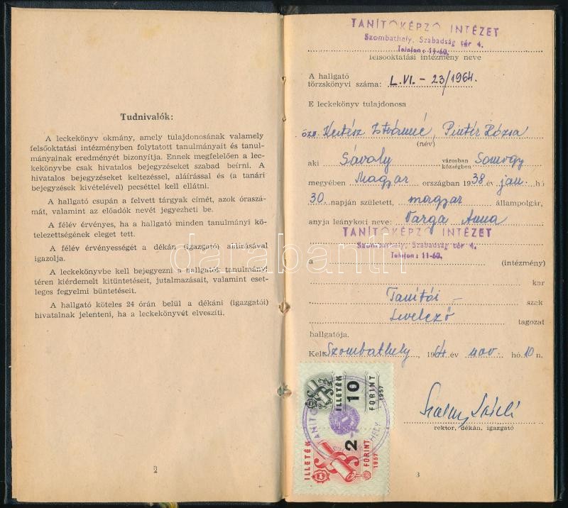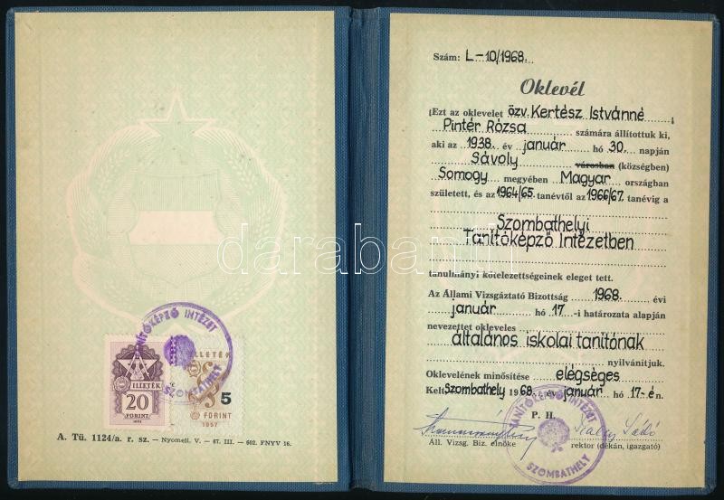 1964-1968 A Szombathelyi Tanítóképző Intézet által kiállított leckekön... https://www.darabanth.com/hu/424-Gyorsarveres/424.0/Mutargy-papirregiseg-egyeb/Okmanyok~500018/1964-1968-A-Szombathelyi-Tanitokepzo-Intezet-altal-kiallitott-leckekonyv-es-tanitoi-okle~II2695447