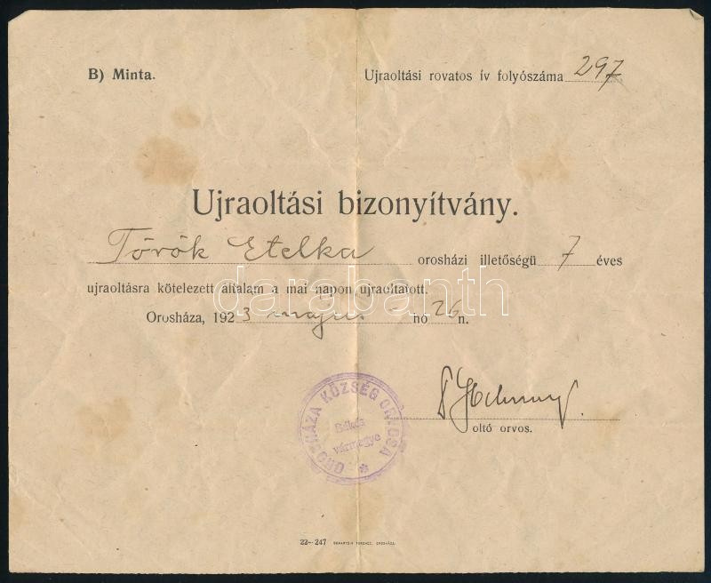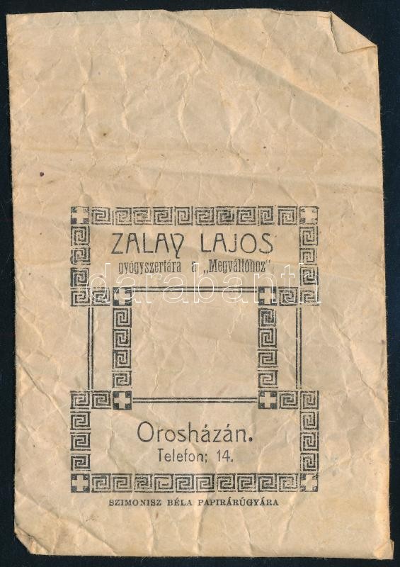Cca 1920-1940 Orosházai orvosi recept, oltási bizonyítvány, ismertető a veszettségről, és Zalay Lajos gyógyszertára a "Megváltóhoz" zacskó !tartalommal!