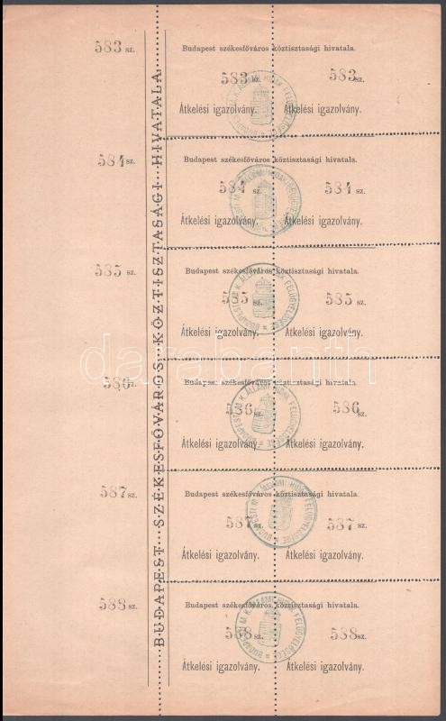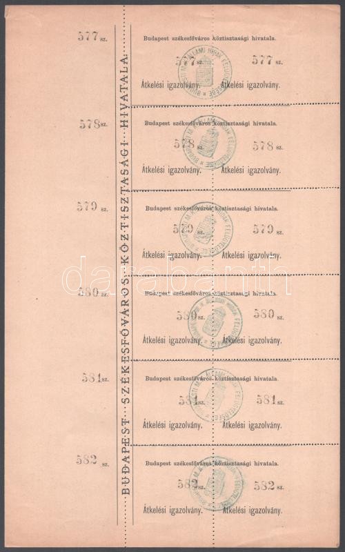cca 1910-1930 Budapest Székesfőváros Köztisztasági Hivatala híd átkelési igazolványok, 6x2 db, sorszámozott, "Budapesti M. K. Állami Hidak Felügyelősége" bélyegzőkkel