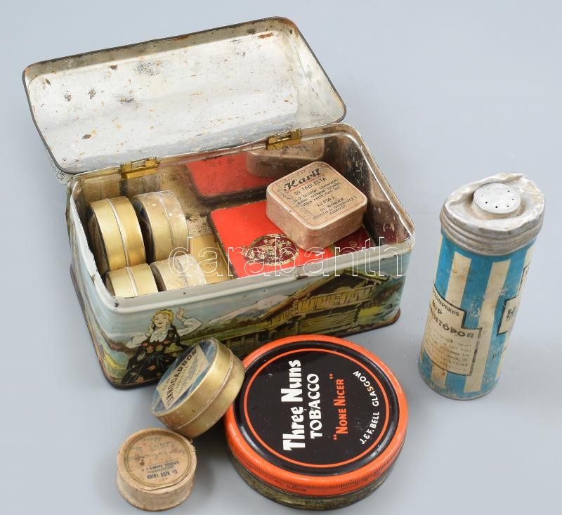 Leírás: Vegyes régi cigarettás, gyógyszeres, gyógyszertári fém és papír dobozok