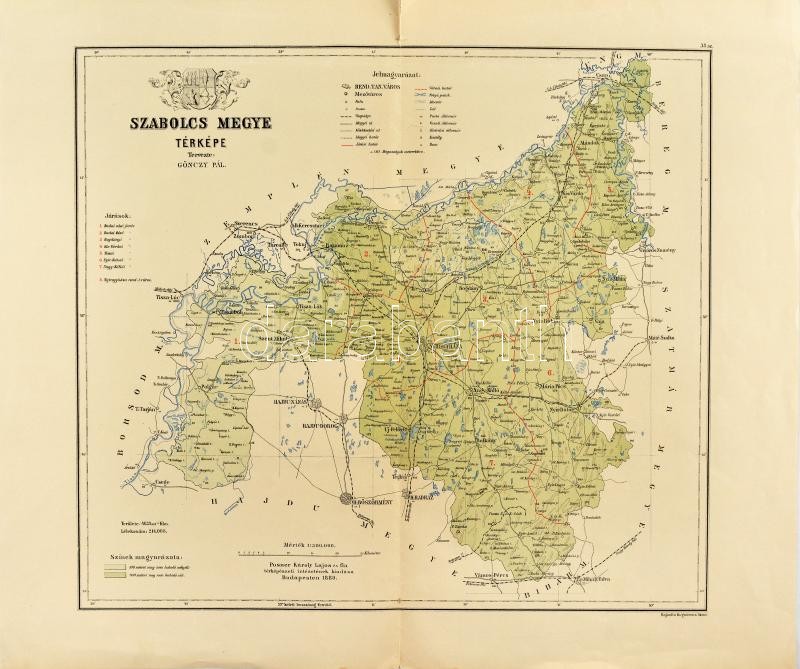 Leírás: 1889 Szabolcs megye térképe, tervezte: Gönczy Pál, rajzolta: Kogutowicz Manó, 1:300.000, Bp., Posner, hajtott, javított, 37x41 cm