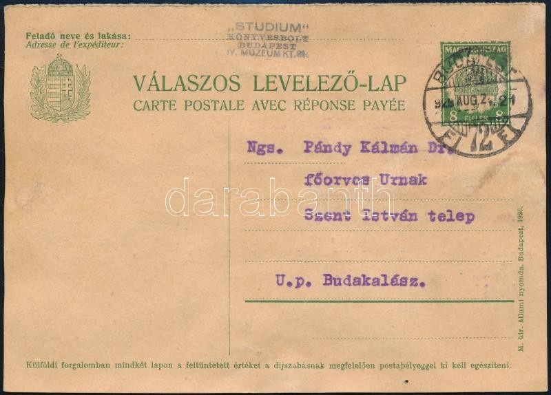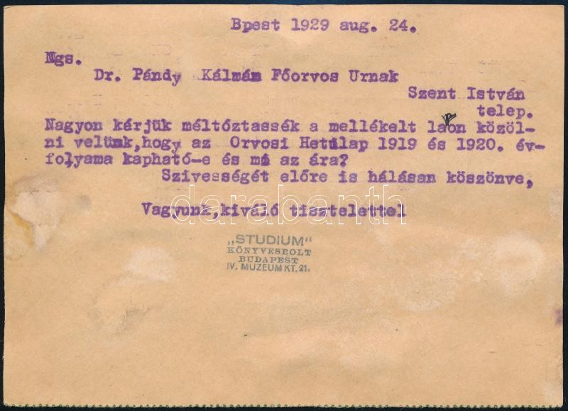 Pándy Kálmán (1868-1945) orvos ideggyógyász levelezése, 1 db levelezől... https://www.darabanth.com/hu/424-Gyorsarveres/424.0/Mutargy-papirregiseg-egyeb/Tortenelmi-dokumentumok-keziratok-erdekessegek~500019/Pandy-Kalman-1868-1945-orvos-ideggyogyasz-levelezese-1-db-levelezolap~II2701029