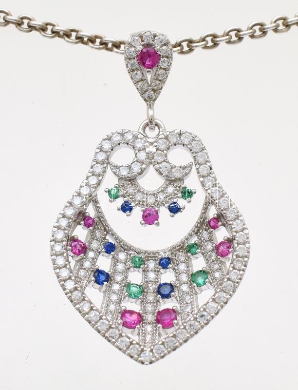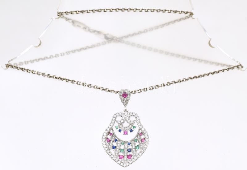 Leírás: Ezüst (Ag) nyaklánc, Szintetikus rubin, smaragd, zafír köves medállal, h: 43cm jelzett, bruttó: 13g