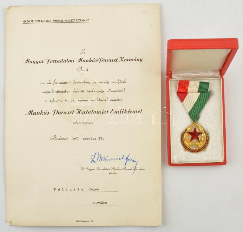 Leírás: 1958. "Munkás-Paraszt Hatalomért Emlékérem" aranyozott, zománcozott bronz kitüntetés mellszalagon, szalagsávval, eredeti dísztokban, adományozói okirattal T:1- NMK 700.