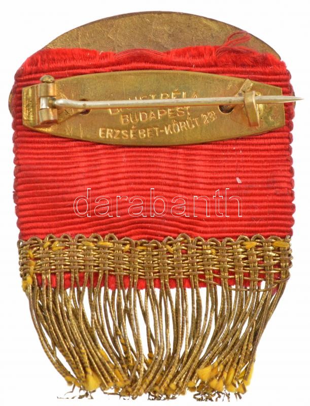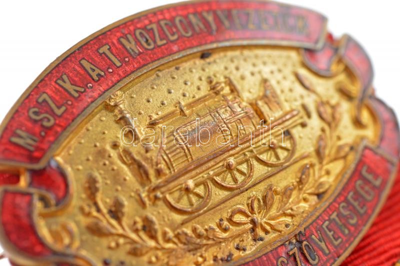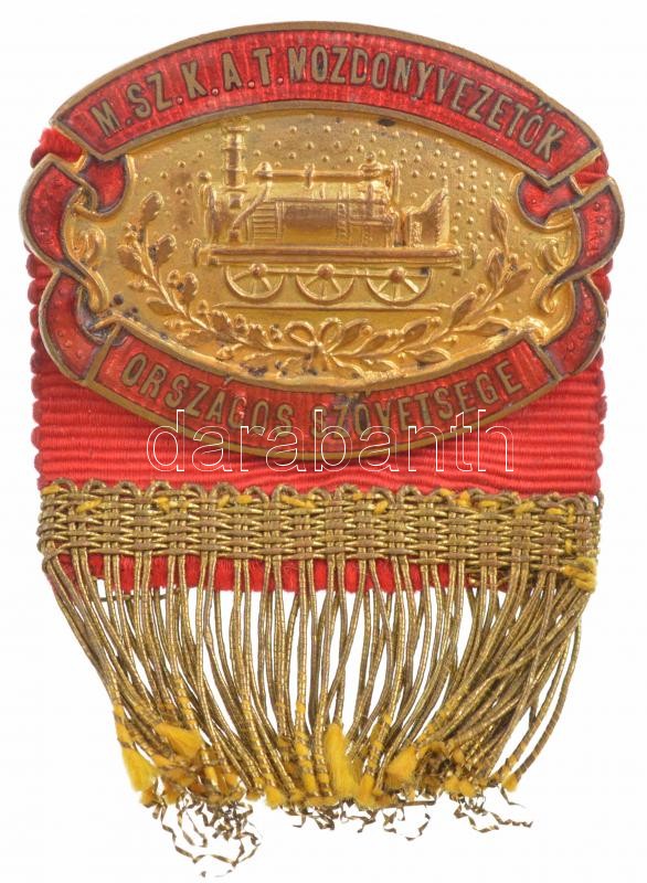 ~1910-1920. "M.Sz. K. A. T. Mozdonyvezetők Országos Szövetsége" zománcozott, aranyozott bronz jelvény, vörös szalaggal, hátlapon "BRUST BÉLA BUDAPEST ERZSÉBET KÖRÚT 23" gyártói jelzéssel (29x40mm) T:1- kissé kopott aranyozás