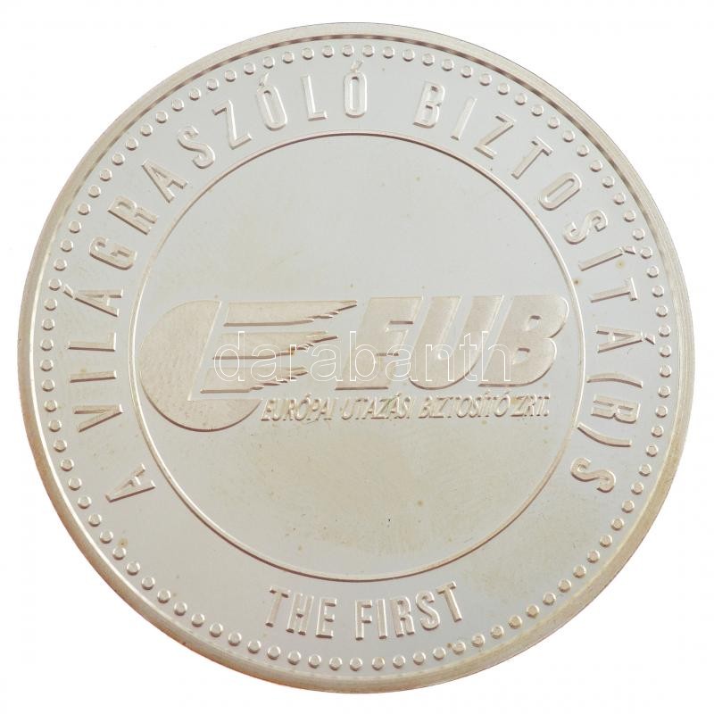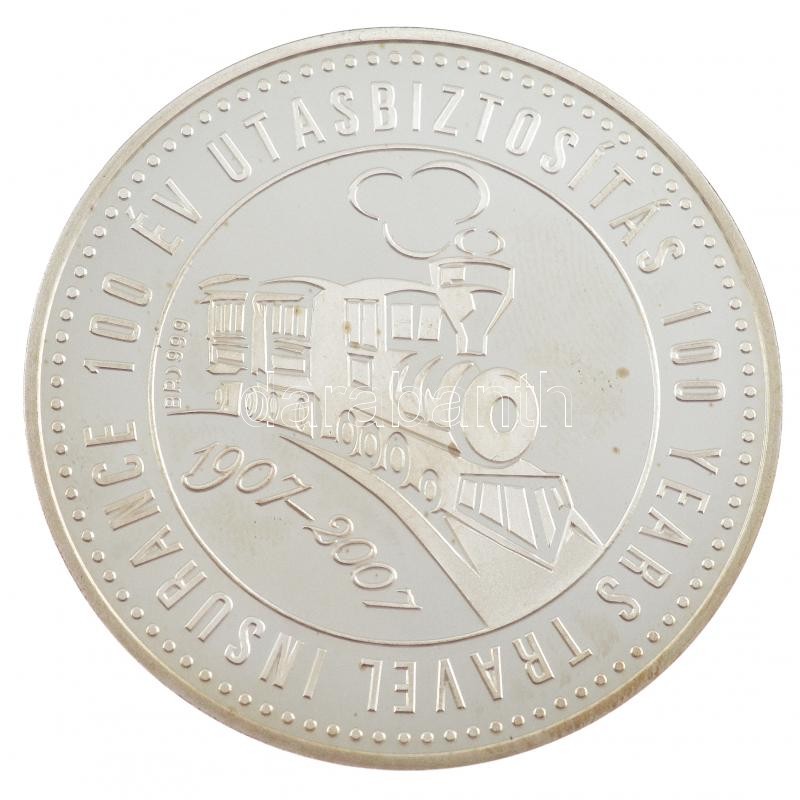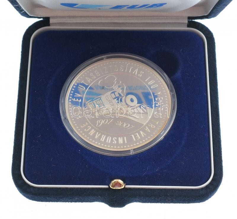 2007. "100 éve utasbiztosítás - 100 Years of Travel Insurance 1907-2007 / A világraszóló biztosítás EUB - Európai Utazási Biztosító Zrt." kétoldalas, jelzett Ag emlékérem, eredeti dísztokoban (31,22g/0.925/42,5mm) T:PP ujjlenyomat