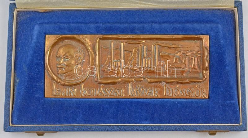 Leírás: ~1970. "Lenin Kohászati Művek Diósgyőr" öntött bronz plakett eredeti dísztokban (59x148mm) T:2