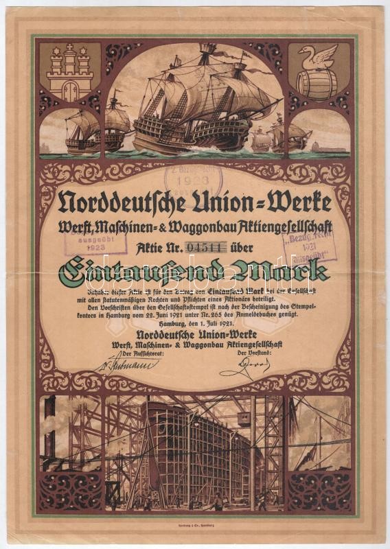 Németország / Weimari Köztársaság / Hamburg. "Északnémet Egyesült Művek Hajó-, Gép- és Vagongyár Részvénytársaság" részvény 1000M-ról bélyegzéssekkel T:III- középen a hajtásnál hosszan beszakadva, jobb felső saroknál szakadás, több kisebb helyen restaurálva
