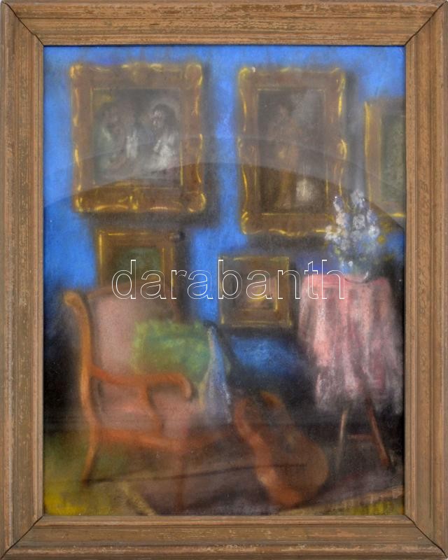Leírás: Olvashatatlan jelzéssel (balra lent): Enteriőr festményekkel. Pasztell, papír. Üvegezett, kopott fakeretben. 50x40 cm