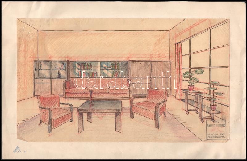 cca 1940 Enteriőr terv korabeli modern bútorokkal, Bélint Ferenc lakberendező szárazbélyegzőjével és pecsétjével. Ceruza, kréta, pauszpapír, papírra kasírozva, kissé sérült, 21x36 cm