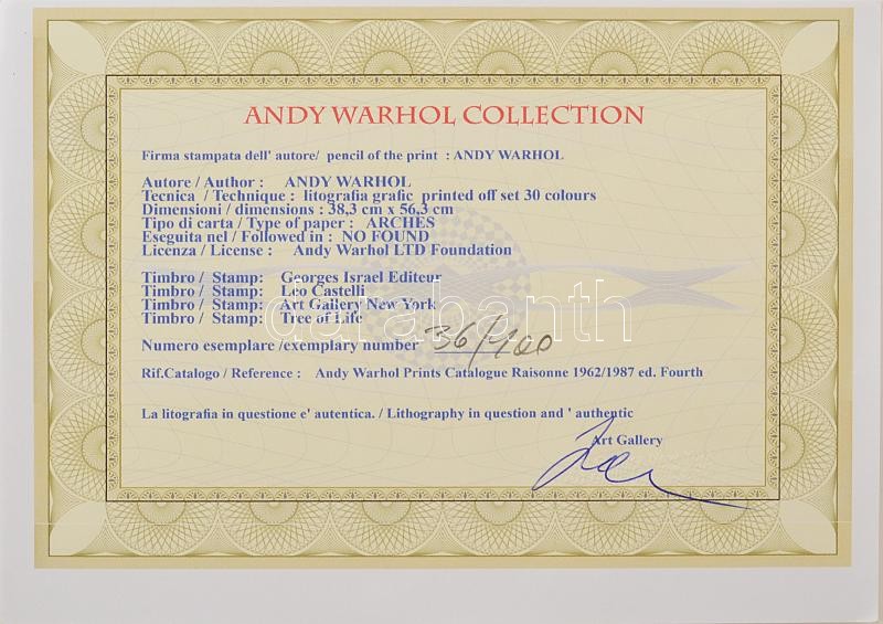 Andy Warhol (1928-1987): Marylin Monroe. Ofszet itográfia, papír. Számozott 36/100, jelzett a nyomaton. Georges Israel editeur szárazpecséttel is jelzett, hozzá tanúsítvány. Offset lithography with attest. 56,3x38,3 cm