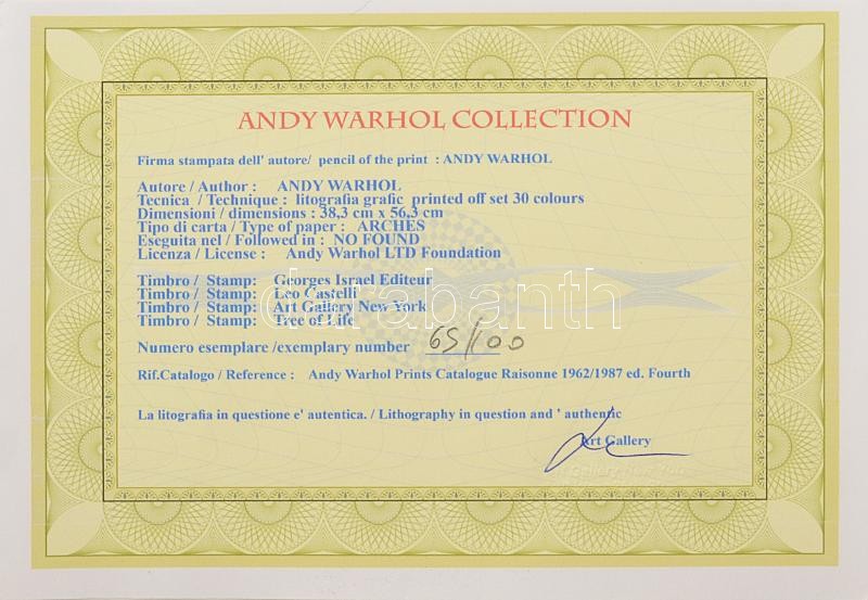 Andy Warhol (1928-1987): Önarckép. Ofszet litográfia, papír. Számozott 65/100, jelzett a nyomaton. Georges Israel editeur szárazpecséttel is jelzett, hozzá tanúsítvány. Offset lithography with attest. Lapméret: 56,3x38,3 cm