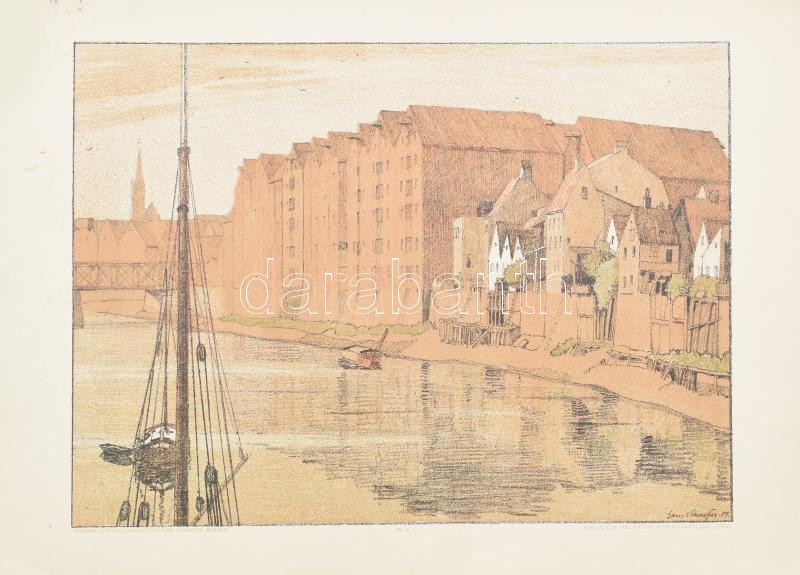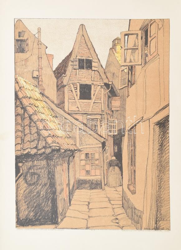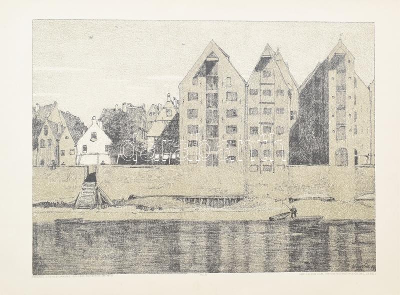Edmund Schaefer (1880-1959), 4 db grafika: Részletek a régi Brémáról (Alt-Bremen). Litográfia, papír, jelzett a litográfián. Carl Vietor, Cassel kiadása. Az 1909-ben megjelent, 10 lapos mappából. Lapszéli kisebb szakadásokkal. 37x27 cm és hasonló méretben.