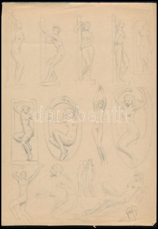 Leírás: Jakab Gyula (1910-1991): Női akt vázlatok, ceruza, papír, 29×20 cm
