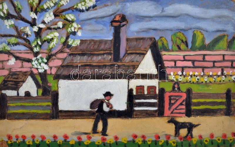 Leírás: Nyergesi István (1900-1989): Kutya és gazdája. Olaj, farost, jelzett a hátoldalán, sérült. 27×42,5 cm