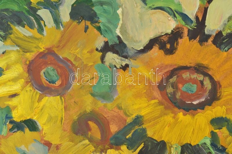 Schéner Mihály (1923-2009): Napraforgók. Olaj, farost, jelzett. Hátoldalán Debreceni Műhely Képző- és Iparművészeti Alkotóközösség 89/1924 szűriszámmal ellátott raglapjával. Fa keretben, 60×80 cm