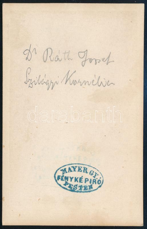 cca 1865 Dr. Ráth József és Szilágyi Kornélia, keményhátú fotó Mayer G... https://www.darabanth.com/hu/425-Gyorsarveres/425.0/Fotomuveszet/Foto~500022/cca-1865-Dr-Rath-Jozsef-es-Szilagyi-Kornelia-kemenyhatu-foto-Mayer-Gy-pesti-mutermebo~II2706201