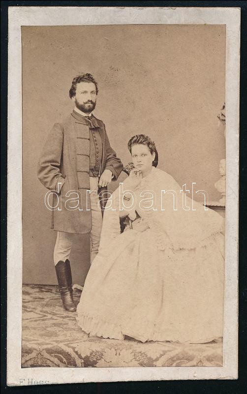 Leírás: cca 1870-1890 Pauli Richárd (szül. Paulikovics) (1835-1901) operaénekes (tenor), és felesége, Markovits Ilka (1839-1915) operaénekesnő (szoprán), keményhátú fotó Fridolin Hess lugosi műterméből, vizitkártya, hátoldalán feliratozott, alul körbevágott, 10x6 cm