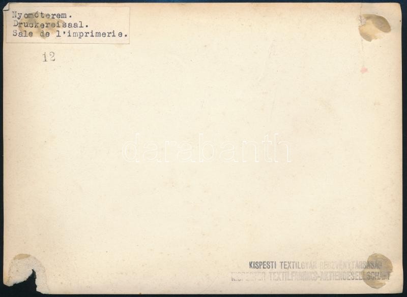 cca 1940 Nyomóterem, Kispesti Textilgyár Részvénytársaság, feliratozva... https://www.darabanth.com/hu/425-Gyorsarveres/425.0/Fotomuveszet/Foto~500022/cca-1940-Nyomoterem-Kispesti-Textilgyar-Reszvenytarsasag-feliratozva-pecsettel-sarokhian~II2706811