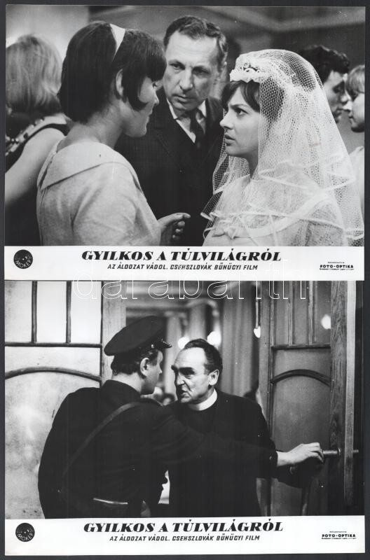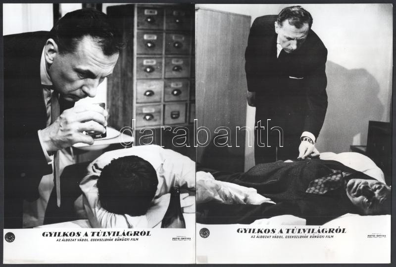 cca 1968 ,,Gyilkos a túlvilágról" című csehszlovák bűnügyi film jelenetei és szereplői, 11 db vintage produkciós filmfotó, a használatból eredő (esetleges) kisebb hibákkal, ezüst zselatinos fotópapíron, + hozzáadva 1 db szöveges kisplakát, 18x24 cm