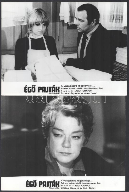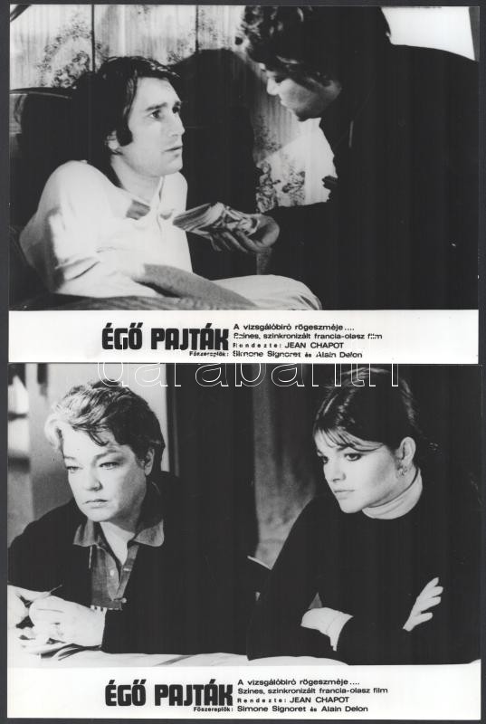 cca 1973 ,,Égő pajták - egy vizsgálóbíró rögeszméje" című francia - olasz film jelenetei és szereplői, 6 db vintage produkciós filmfotó, a használatból eredő (esetleges) kisebb hibákkal, ezüst zselatinos fotópapíron, 18x24 cm