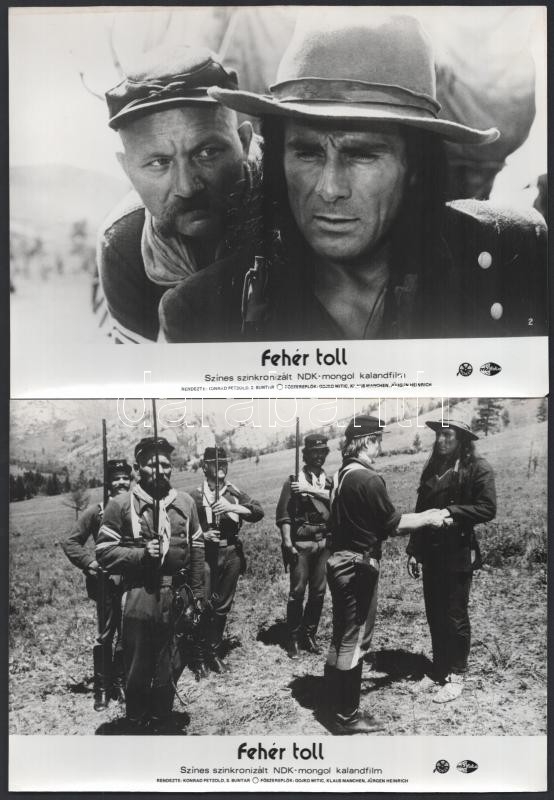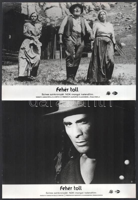 cca 1983 ,,Fehér Toll" című NDK - mongol westernfilm jelenetei és szereplői, 6 db vintage produkciós filmfotó, a használatból eredő (esetleges) kisebb hibákkal, ezüst zselatinos fotópapíron, 18x24 cm
