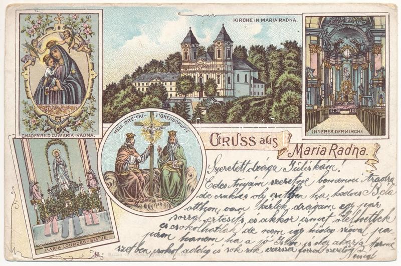 Leírás: 1900 Máriaradna, Radna; Gnadenbild zu Maria-Radna, Kirche, Inneres der Kirche, Maria Lourdes-Statue, Heil. Dreifaltigkeitsgruppe / Kegytemplom, belső, kegyképek / pilgrimage church, interior. Art Nouveau, floral, litho (EB)