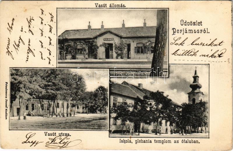1905 Perjámos, Periam; vasútállomás, Vasút utca, Iskola, plébániatemplom az ófaluban. Friedmann József kiadása / railway station, street view, school, parish church (r)