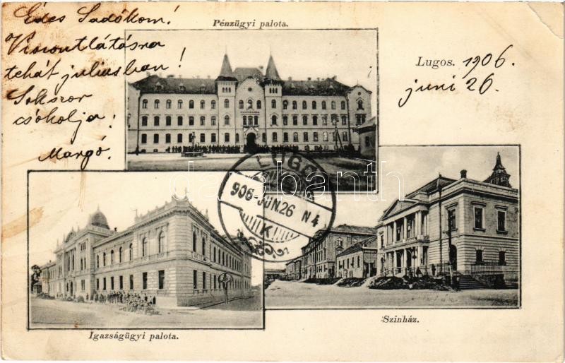 1906 Lugos, Lugoj; Pénzügyi palota, Igazságügyi palota, Színház. Szikl... https://www.darabanth.com/hu/425-Gyorsarveres/425.0/Kepeslapok/Erdely~2000006/1906-Lugos-Lugoj-Penzugyi-palota-Igazsagugyi-palota-Szinhaz-Sziklai-Lajos-kiadasa-fina~II2705807