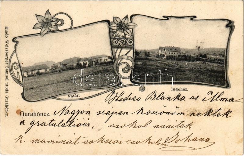 Leírás: 1907 Gurahonc, Honctő, Gurahont; Fő tér, Indóház, vasútállomás. Weiszberger Sámuel utóda kiadása / main square, railway station. Art Nouveau, floral (szakadás / tear)