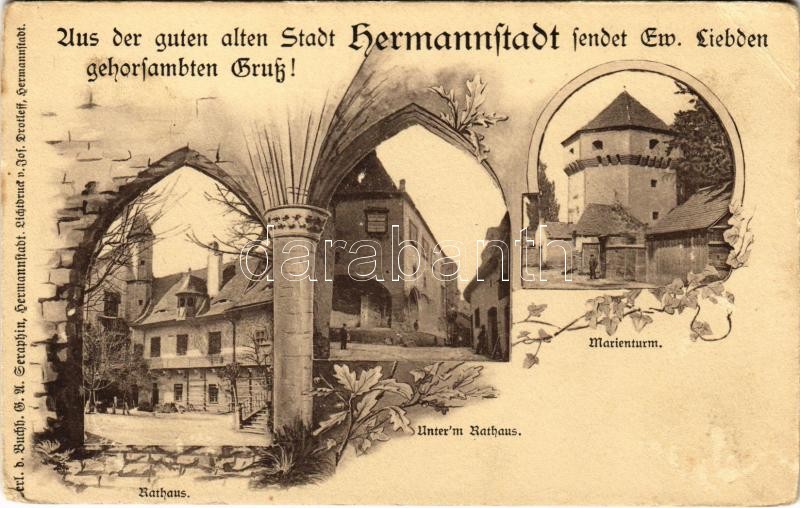Leírás: 1909 Nagyszeben, Hermannstadt, Sibiu; Rathaus, Unter'm Rathaus, Marienturm / Városháza, Mária-torony / town hall, tower. Art Nouveau, floral (EB)