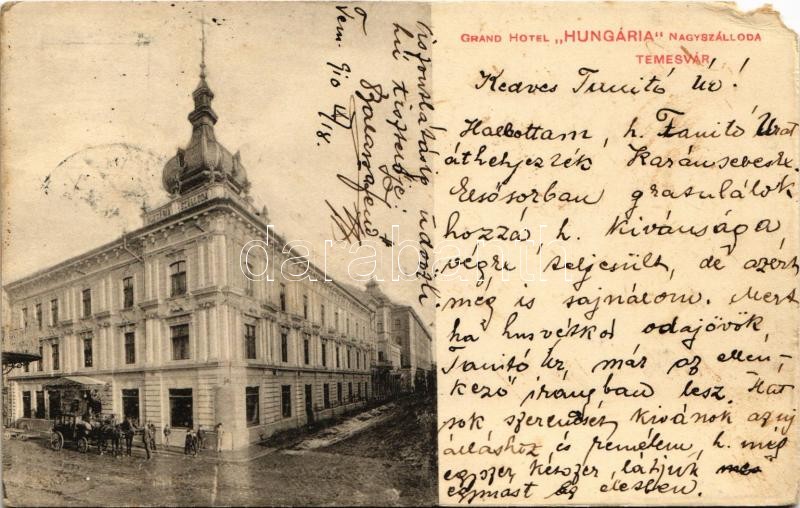 1910 Temesvár, Timisoara; Grand Hotel Hungária szálloda / hotel (b) https://www.darabanth.com/hu/425-Gyorsarveres/425.0/Kepeslapok/Erdely~2000006/1910-Temesvar-Timisoara-Grand-Hotel-Hungaria-szalloda-hotel-b~II2712864