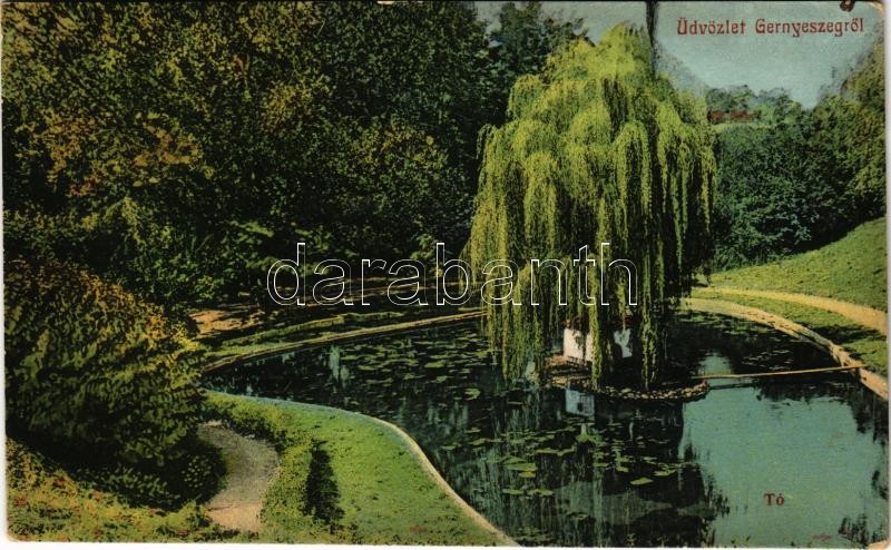 Leírás: 1913 Gernyeszeg, Gornesti; Teleky kastély parkja. Fogyasztási szövetkezet kiadása. Lang Henrik fényképészeti műterme (Brassó) / castle park, lake (EK)