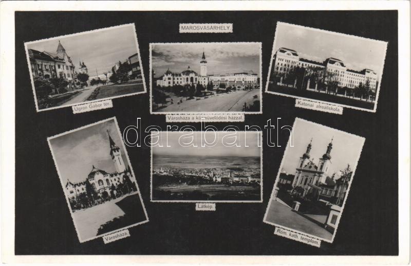 Marosvásárhely, Targu Mures; Ugron Gábor tér, Városháza, Közművelődési Ház, Katonai alreáliskola, Római katolikus templom / square, town hall, community center, military school, Catholic church