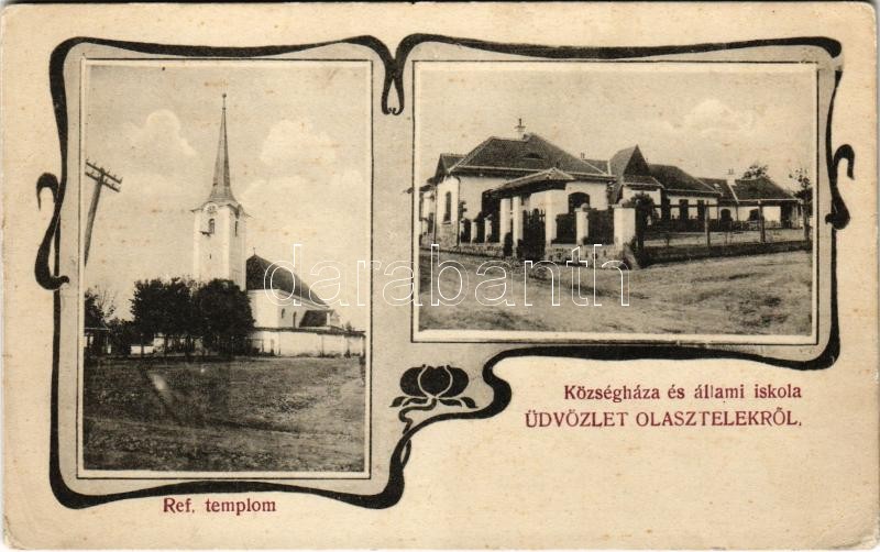 Olasztelek, Talisoara; Református templom, Községháza és állami iskola. Szilágyi Artur műterméből / Calvinist church, town hall, school. Art Nouveau (EB)