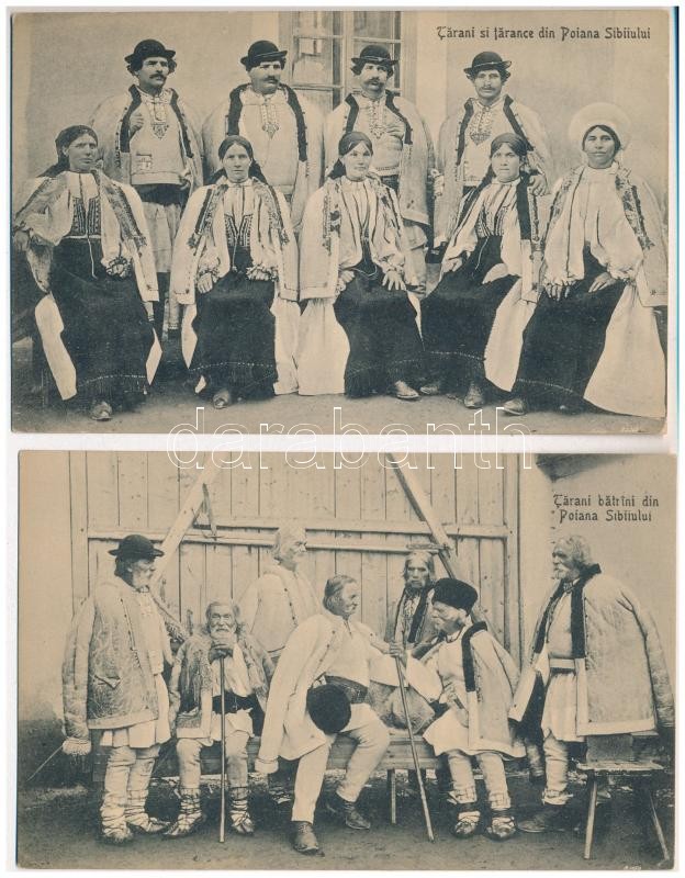 Leírás: Polyán, Poiana Sibiului; Tarani si tarance, batrini. Editura Dumitru B. Comsa / népviselet / folklore - 2 db régi képeslap / 2 pre-1945 postcards
