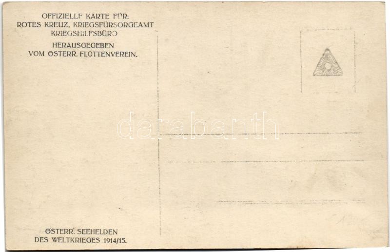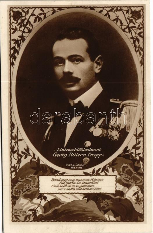 Der heldenmütige Kommandant des U5 Linieschiffsleutnant Georg Ritter v. Trapp. Offizielle Karte für Rotes Kreuz, Kriegsfürsorgeamt, Kriegshilfsbüro. Herausgegeben vom Österr. Flottenverein. Österr. Seehelden des Weltkrieges 1914/15. K.u.K. Kriegsmarine / Georg von Trapp, Austro-Hungarian Navy officer, commander of SM U-5 submarine. Phot. J. Harkányi. Wien, 1915. s: Harry Heusser