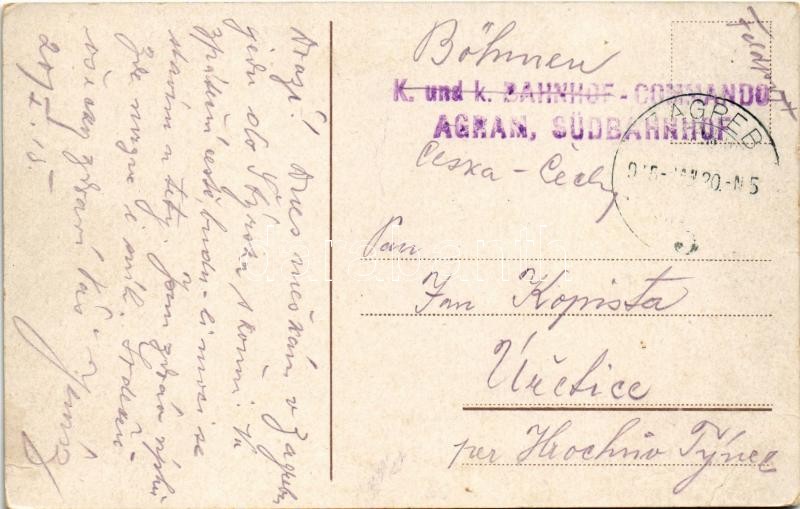 Leírás: 1915 Zagreb, Agram, Zágráb; Jelacicev trg, Apoteka / square, market, shops, pharmacy + "K.u.K. Bahnhof-Commando Agram, Südbahnhof" (EK)