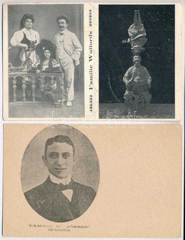 Leírás: 4 db régi képeslap: Bajor Gizi, K. Pálmay Ilka, Tamási W. József dal-komikus, Familie Wallords cirkuszi akrobaták