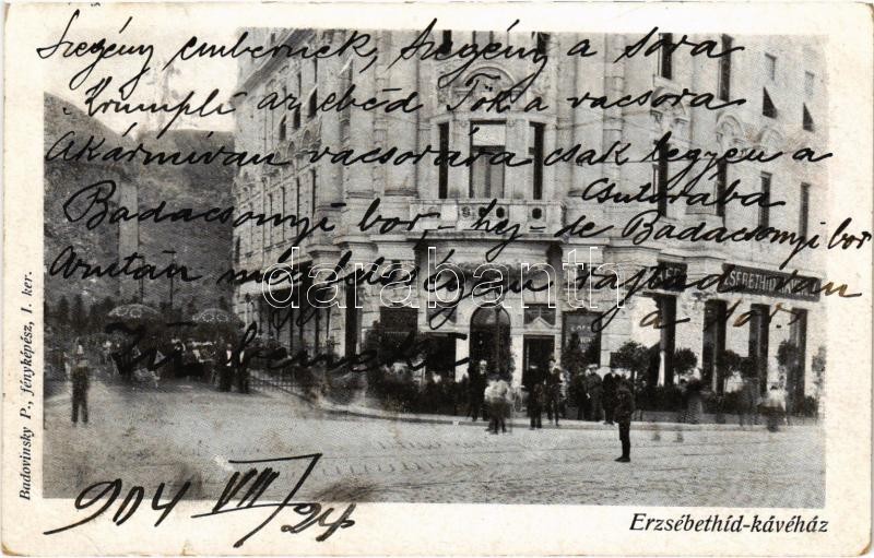 Leírás: 1904 Budapest I. Tabán, Döbrentei tér, Erzsébethíd kávéház. Budovinsky P. fényképész (kis szakadás / small tear)