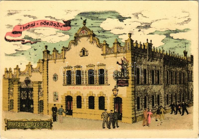 Budapest VII. Hági söröző reklámja. Huszár utca 7. (EK) https://www.darabanth.com/hu/425-Gyorsarveres/425.0/Kepeslapok/Magyarorszag~2000005/Budapest-VII-Hagi-sorozo-reklamja-Huszar-utca-7-EK~II2707468