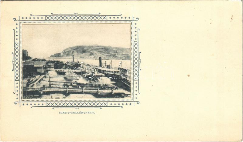 Leírás: Budapest XI. Szent Gellérthegy, pesti kikötő, gőzhajók, Erzsébet híd még nincs megépítve. Art Nouveau