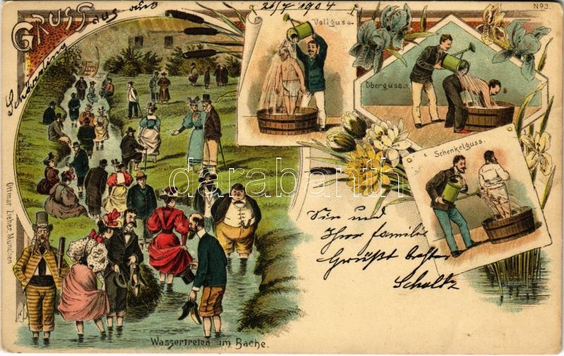 Leírás: 1904 Gruss aus... Wassertreten im Bache. Vollguss, Oberguss, Schenkelguss / Spa humour. Ottmar Zieher Art Nouveau, floral, litho