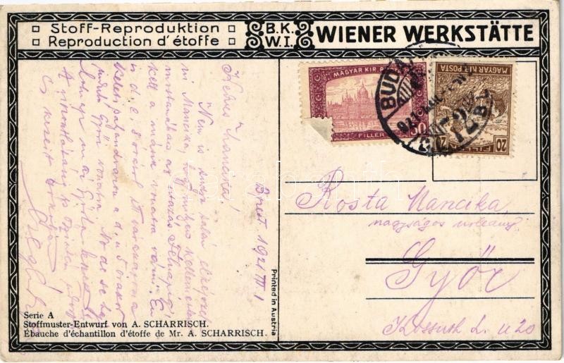 1921 Stoff-Reproduktion. B.K.W.I. Wiener Werkstätte Serie A. Stoffmust... https://www.darabanth.com/hu/425-Gyorsarveres/425.0/Kepeslapok/Muveszlapok~2000042/1921-Stoff-Reproduktion-BKWI-Wiener-Werkstatte-Serie-A-Stoffmuster-Entwurf-von-A-Scharrisch~II2705907