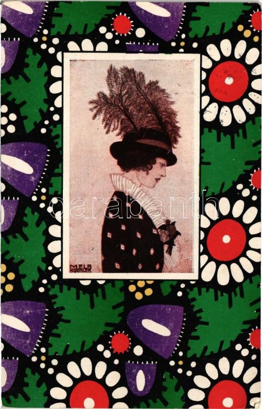 Leírás: 1921 Stoff-Reproduktion. B.K.W.I. Wiener Werkstätte Serie Q. Stoffmuster-Entwurf von W. Jonas. Art Nouveau s: Mela Koehler (EK)